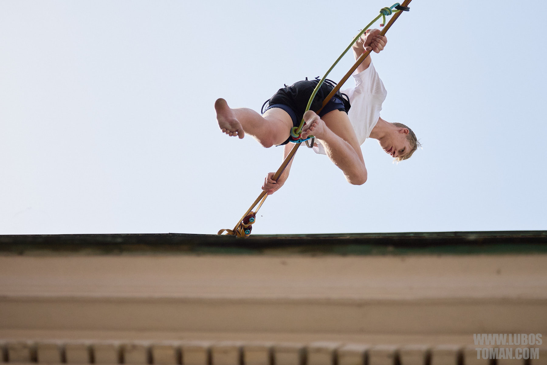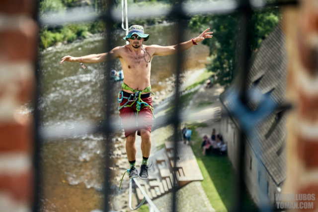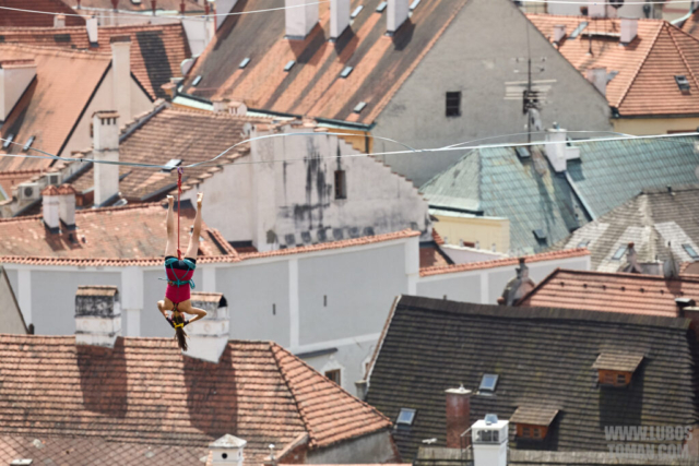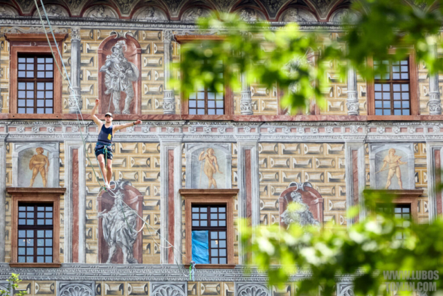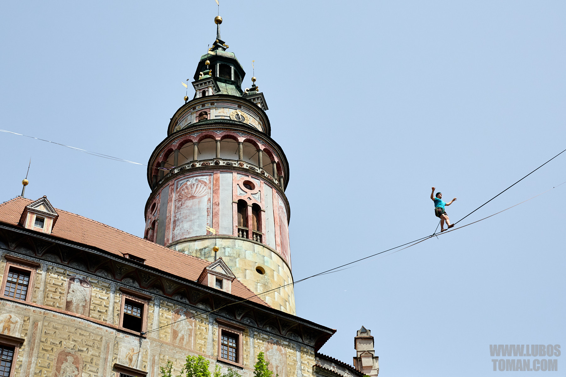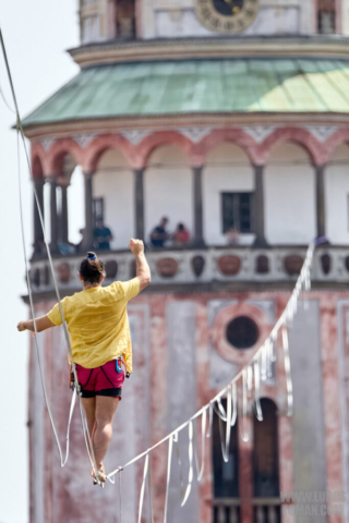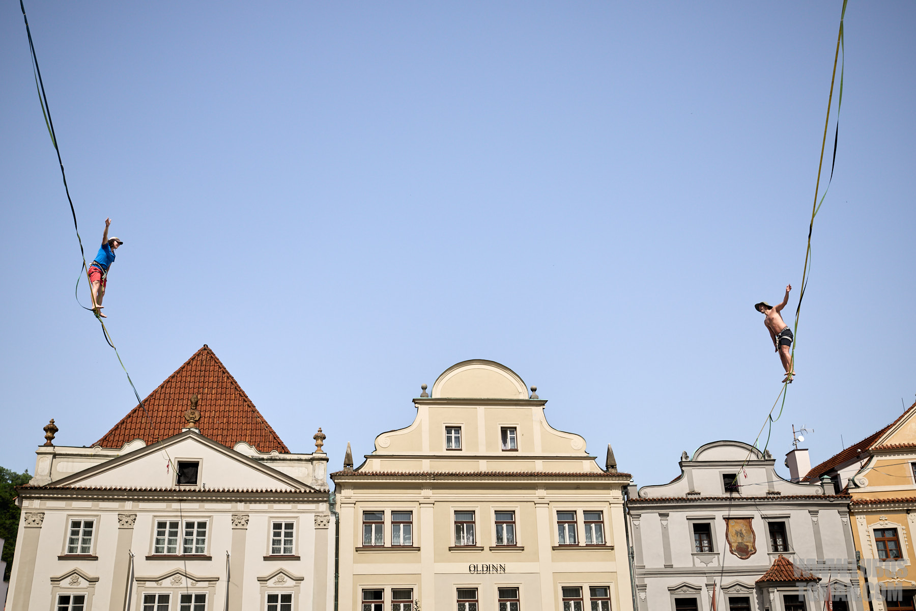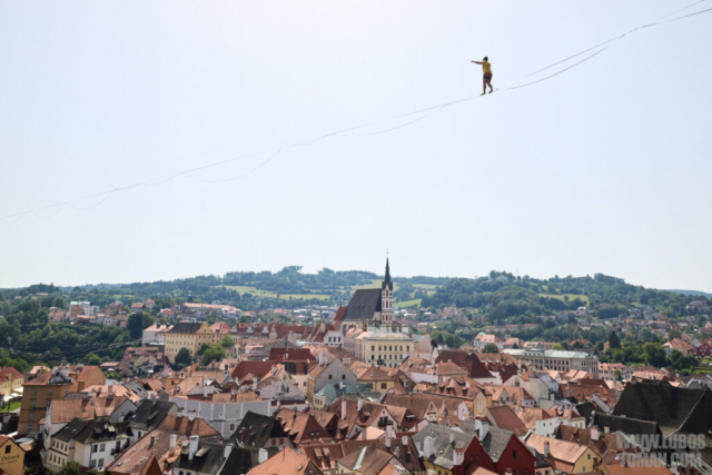 „Provazochodci“ se procházeli na výškových lajnách nad historickým centrem Českého Krumlova v rámci Highline Festu Český Krumlov 2024.