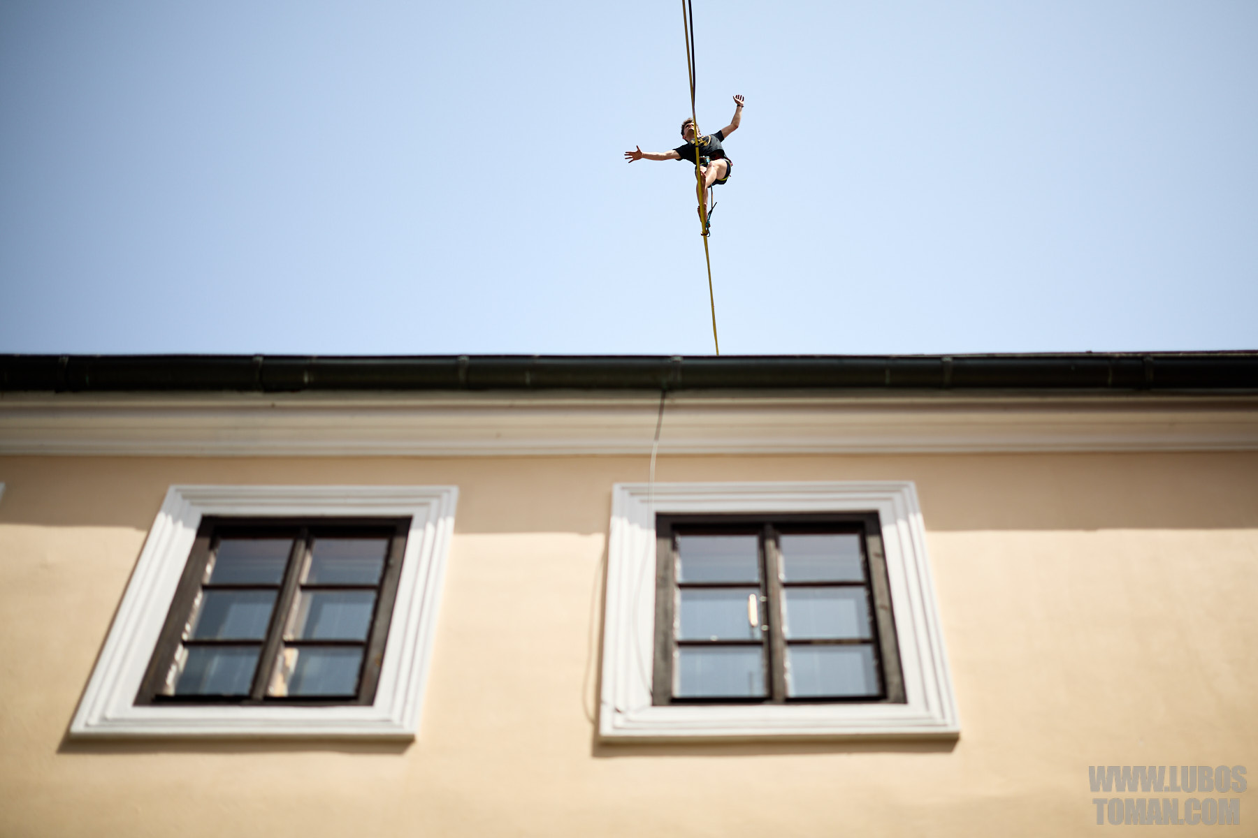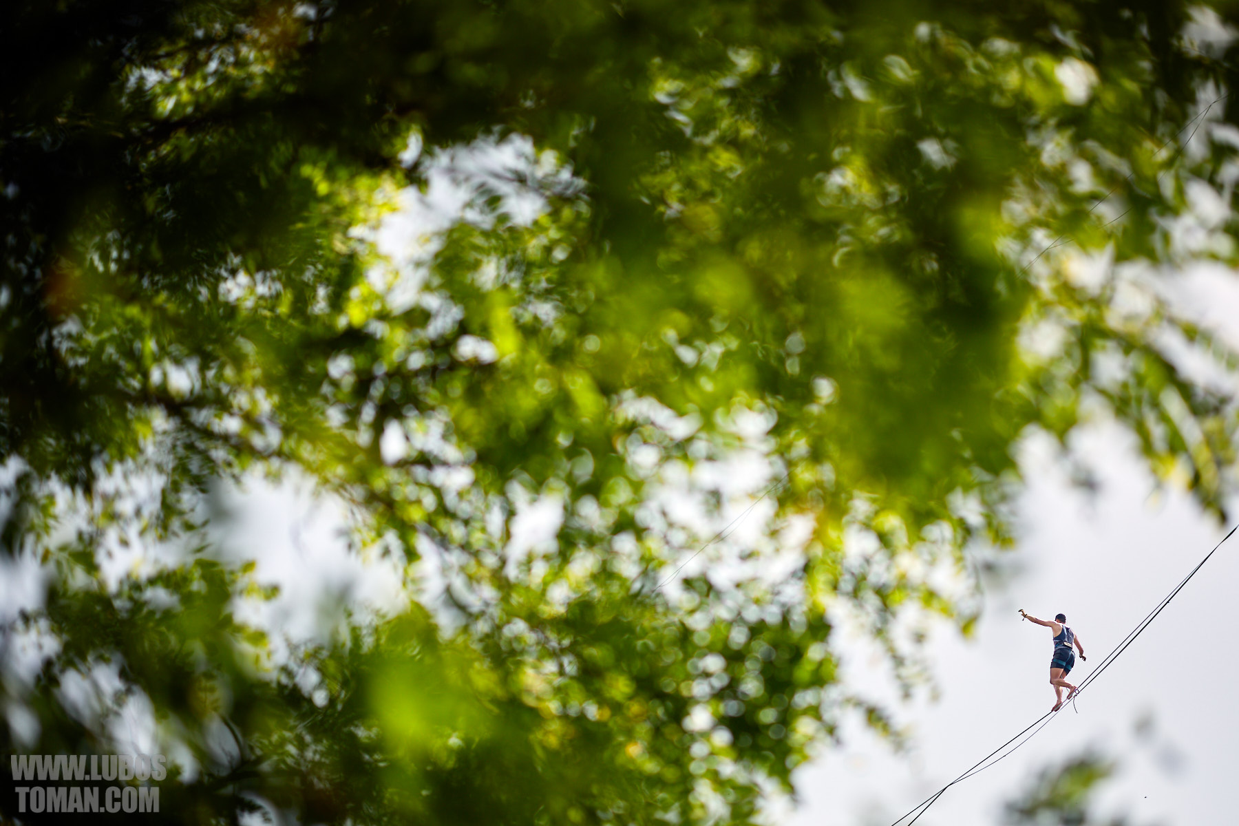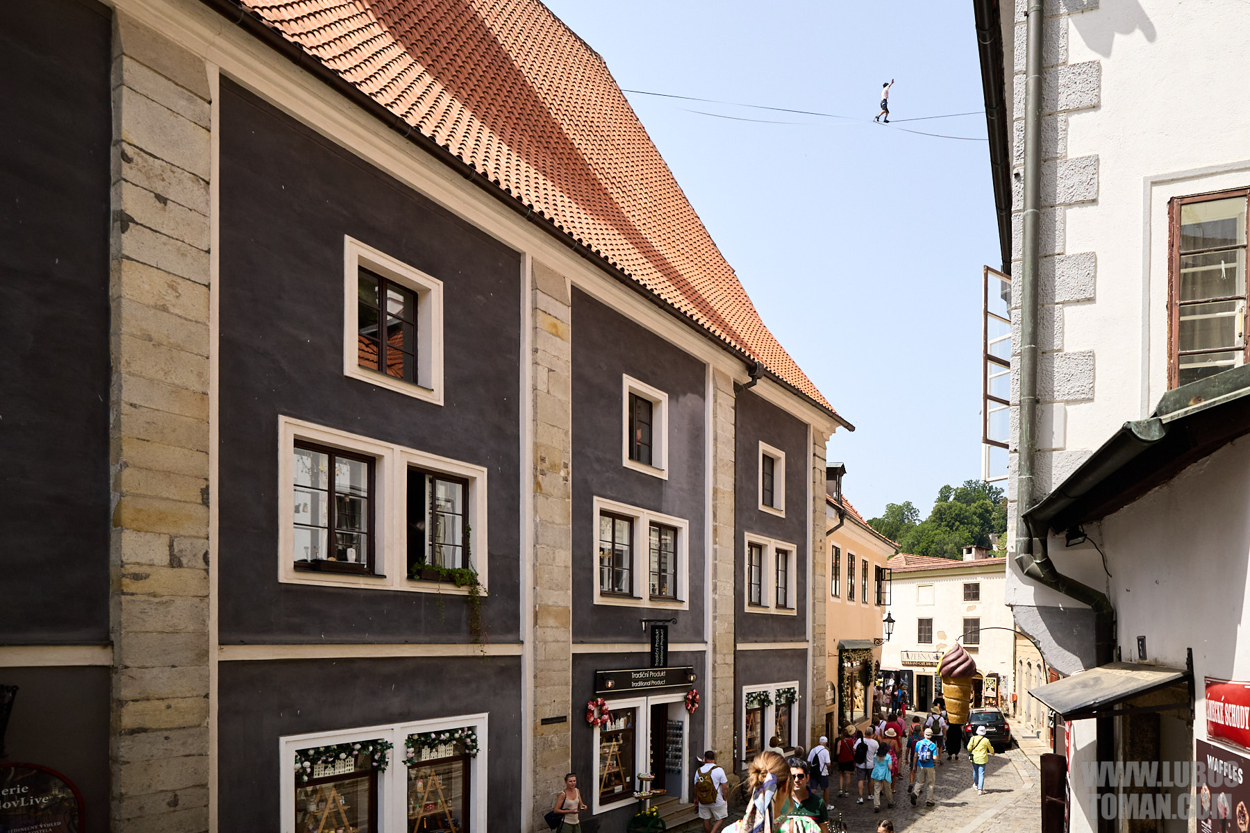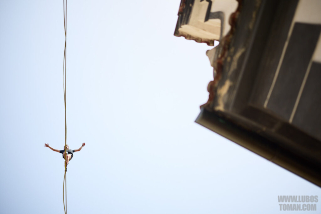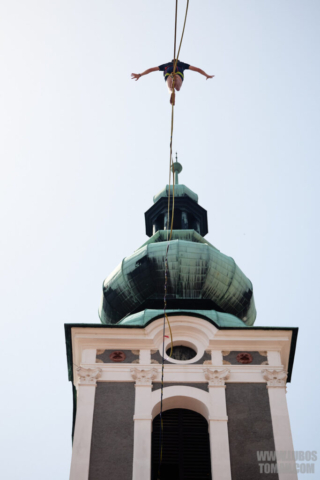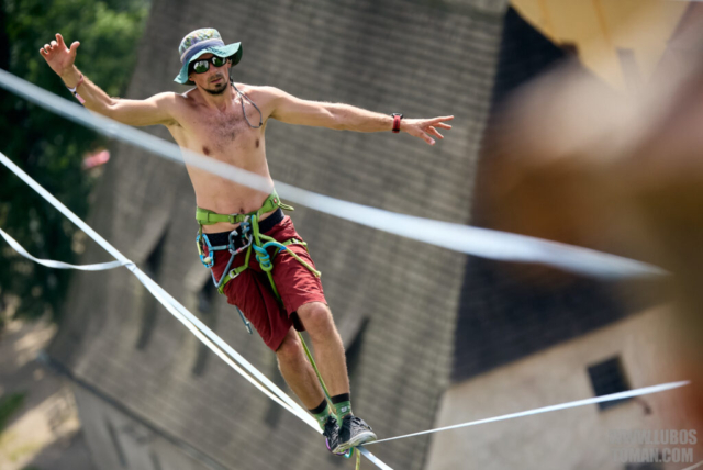 „Provazochodci“ se procházeli na výškových lajnách nad historickým centrem Českého Krumlova v rámci Highline Festu Český Krumlov 2024.